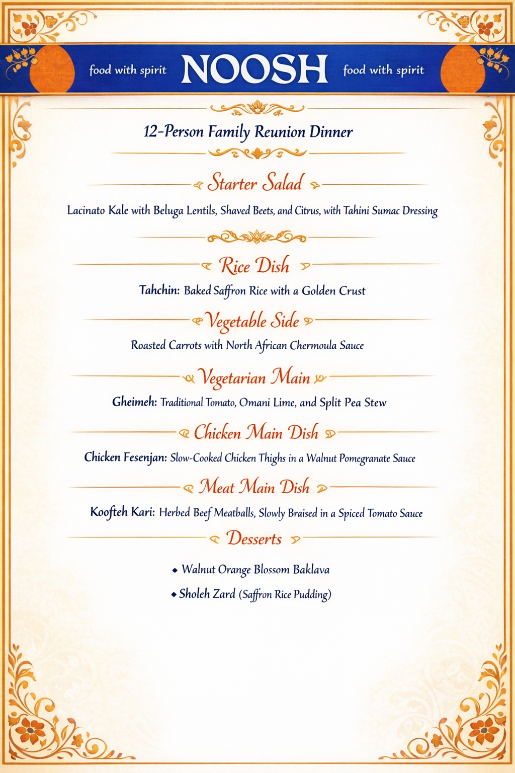 Noosh covers classical Persian Cuisine (pictured here!) and globally-inspired flavors, with an approach rooted in delight, sophistication, flavor, and beauty.